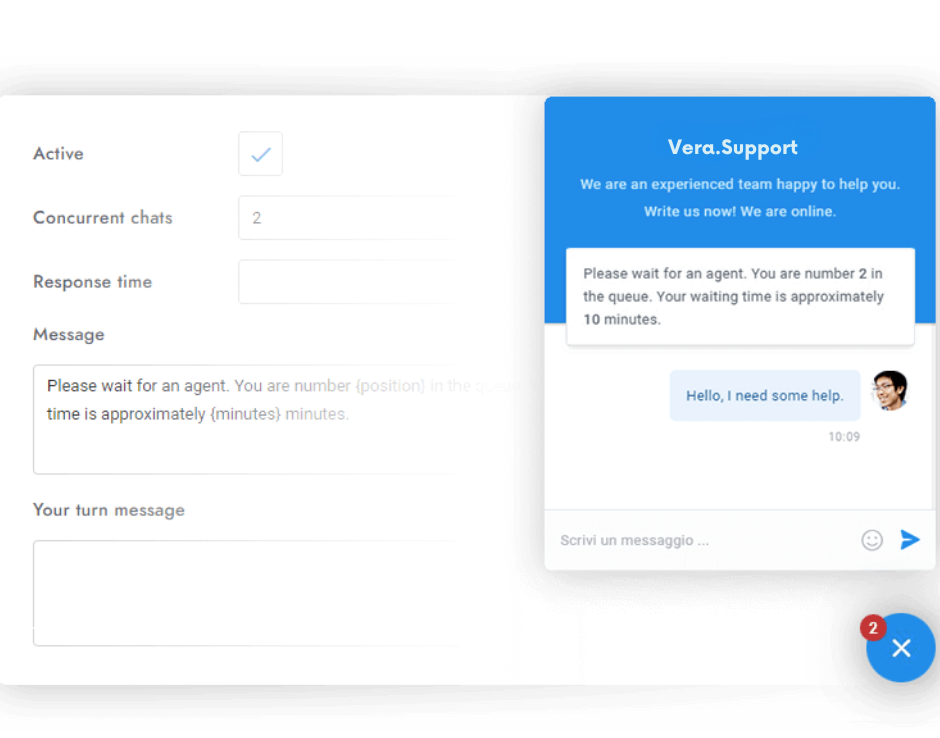 Keep your visitors informed with their exact position in the queue and estimated waiting time, updated in real time. Vera Support automatically distributes conversations among available agents and allows you to set limits for concurrent chats, ensuring smooth and efficient customer support.